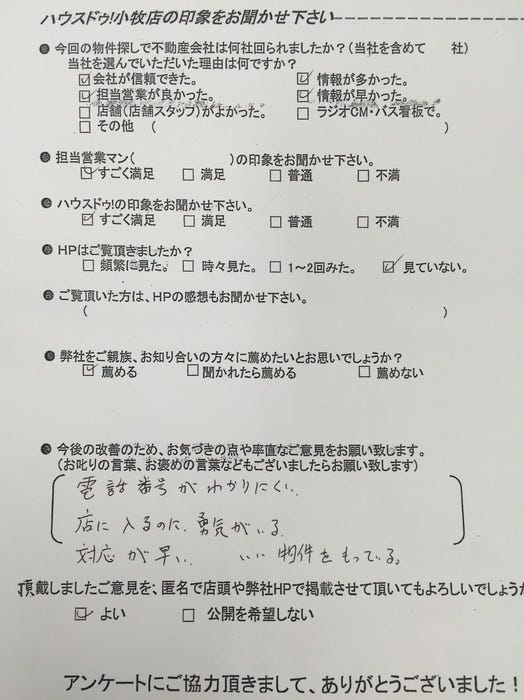 ・電話番号がわかりにくい ・店に入るのに勇気がいる ・対応が早い ・いい物件を持っている
