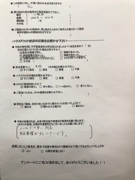 メールでの早い対応 駐車場が少し小さいです。